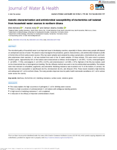 Genetic characterization and antimicrobial susceptibility of Escherichia coli isolated from household water sources in northern Ghana.
