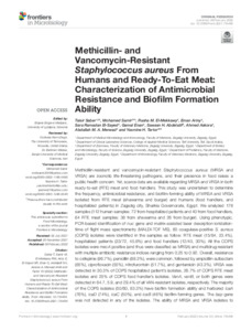 Methicillin- and Vancomycin-resistant staphylococcus aureus from humans and ready-to-eat meat: characterization of antimicrobial resistance and biofilm formation ability.