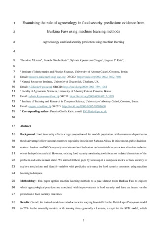 Methodology: This paper applies machine learning methods to a panel dataset from Burkina Faso to explore which agroecological practices are associated with improvements in food security and have an impact on the prediction of food security outcomes.