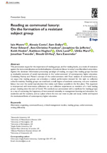 This provocation argues for the importance of reading groups, and for reading books, as a mode of resistance against the instrumentalisation and individualisation of academic labour in today’s neo-liberalised universities. Against the dominant ‘information processing’ paradigm of reading, we argue that reading groups function as invaluable moments of social reproduction in the ‘undercommons’ of contemporary higher education. Combining Harney and Moten’s concept of the undercommons with Ross’ analysis of communal luxury, we argue that reading groups can articulate a radical, performative demand for the right to collective cultural creativity. Reading groups can steal back a small degree of academic autonomy, not over academic labour, but over the social reproduction that makes such labour possible in the first place. This argument is interspersed with intermezzo reflections on our collective experiences as members of a ‘viral reading group’, meeting since the start of Covid. We conclude our provocation with a manifesto for reading groups as a way of contesting the hegemony of instrumental rationality in management learning and education, for academics and for students, and as a place where the two can meet to plan and study, within and beyond the institutional limits of contemporary higher education.
