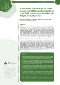 Consumers’ preferences for sweet potato in Viet Nam and implications for CGIAR market segmentation and target product profiles.