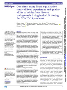 One virus, many lives: a qualitative study of lived experiences and quality of life of adults from diverse backgrounds living in the UK during the COVID-19 pandemic.