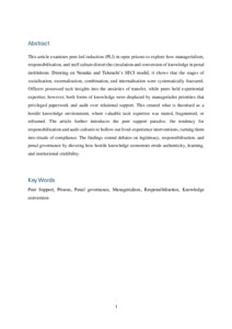 This article examines peer-led induction (PLI) in open prisons to explore how managerialism, responsibilisation, and staff culture distort the circulation and conversion of knowledge in penal institutions. Drawing on Nonaka and Takeuchi’s SECI model, it shows that the stages of socialisation, externalisation, combination, and internalisation were systematically fractured. Officers possessed tacit insights into the anxieties of transfer, while peers held experiential expertise; however, both forms of knowledge were displaced by managerialist priorities that privileged paperwork and audit over relational support. This created what is theorised as a hostile knowledge environment, where valuable tacit expertise was muted, fragmented, or reframed. The article further introduces the peer support paradox: the tendency for responsibilisation and audit cultures to hollow out lived-experience interventions, turning them into rituals of compliance. The findings extend debates on legitimacy, responsibilisation, and penal governance by showing how hostile knowledge economies erode authenticity, learning, and institutional credibility.