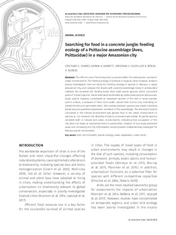 Soares, Cristiane S., Barnett, Adrian A.., Scudeller, Veridiana V. and Borges, Sergio H. (2023) Searching for food in a concrete jungle: feeding ecology of a Psittacine assemblage (Aves, Psittacidae) in a major Amazonian city. Annals of the Brazilian Academy of Sciences (Anais da Academia Brasileira de Ciências), 95 (3):e20220606. pp. 1-19. ISSN 0001-3765 (Print), 1678-2690 (Online) (doi:10.1590/0001-3765202320220606.)