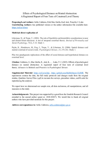 | Uncontrolled Keywords: | construal level theory, mental abstraction, psychological distance, replication, multi-lab |