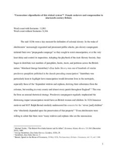 This article will use the records of the Slave Compensation Commission to examine how women experienced and negotiated property- and slave-ownership in nineteenth- century Britain. Demonstrating that women played a crucial role in facilitating the transmission of wealth rooted in enslavement into metropolitan society, it will show how they utilised, manipulated - and were restricted by - the financial mechanisms and legal frameworks that underpinned the British economy. Women’s engagement with the compensation process illustrates both the economic opportunities open to middle and upper-class women in the early nineteenth century and the ways that female property- ownership was meditated and constrained. But we cannot elide the nature of this particular form of ‘property’. These women were significant players in a system dependent on the violent exploitation of other human beings. The article shows the different ways that British women claimed enslaved people as property, and how they used racialised violence to negotiate and wield power in a patriarchal society and claim, establish and reinforce their own potentially precarious positions. In doing so, it demonstrates the importance of interrogating the complex nexus of power relations – gendered, racialised and classed - that shaped how female property- and wealth holders thought, acted and behaved in nineteenth-century Britain.
