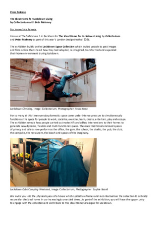 The exhibition designed and curated by Collectarium (Allyson Waller + Sophie Beard) in collaboration with Peter Maloney. The exhibition builds on the Lockdown Space Collection which invited people to post images/films online that shared how they had adapted, re-imagined, transformed and expanded their home environment during lockdown. For so many at this time everyday domestic space came under intense pressure to simultaneously function as the space for people to work, socialise, exercise, learn, create, entertain, play and escape. The exhibition reveals how people carried out makeshift and ad hoc interventions to their homes to generate new dynamic, flexible and multi-functional spaces. The once traditional enclosed spaces of privacy and safety now perform as the office, the gym, the school, the studio, the pub, the club, the campsite, the restaurant, the beach and spaces of the imagination. We invite you into the physical space of a house which spatially reframes and recontextualises the collection to critically reconsider the ideal home in our increasingly unsettled times. As part of the exhibition you will have the opportunity to engage with the collection and contribute to The Ideal Home Catalogue for Lockdown Living. Supported by The Centre for Spatial and Digital Ecologies, University of Greenwich.