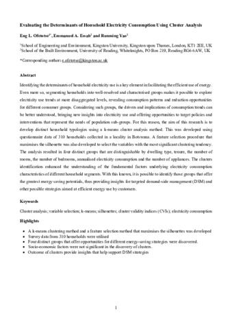 Ofetotse, Eng L., Essah, Emmanuel A. and Yao, Runming (2021) Evaluating the determinants of household electricity consumption using cluster analysis. Journal of Building Engineering, 43:102487. ISSN 2352-7102 (Online) (doi:10.1016/j.jobe.2021.102487)
