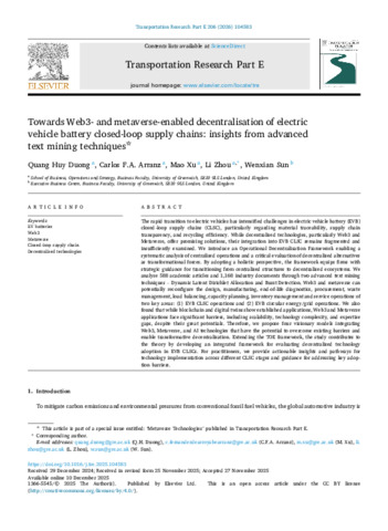 Towards Web3- and metaverse-enabled decentralisation of electric vehicle battery closed-loop supply chains: insights from advanced text mining techniques.