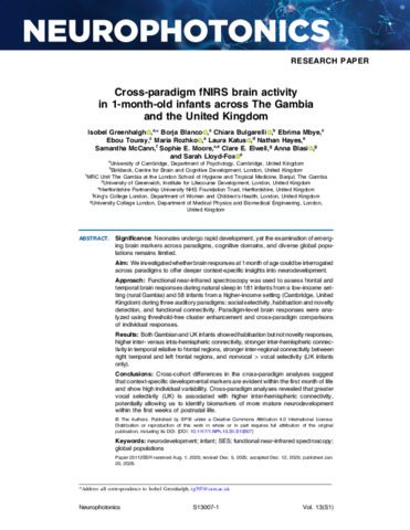 Greenhalgh, Isobel, Blanco, Borja, Bulgarelli, Chiara, Mbye, Ebrima, Touray, Ebou, Rozhko, Maria, Katus, Laura, Hayes, Nathan, McCann, Samantha, Moore, Sophie E., Elwell, Clare E., Blasi, Anna and Lloyd-Fox, Sarah (2026) Cross-paradigm fNIRS brain activity in 1-month-old infants across The Gambia and the United Kingdom. Neurophotonics, 13 (S1):S13007. pp. 1-24. ISSN 2329-423X (Print), 2329-4248 (Online) (doi:10.1117/1.NPh.13.S1.S13007)