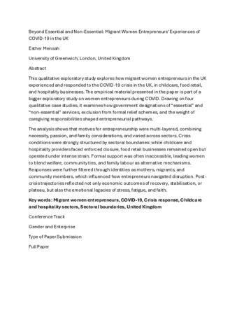 | Uncontrolled Keywords: | migrant women entrepreneurs, COVID-19, crisis response, childcare and hospitality sectors, sectoral boundaries, United Kingdom |