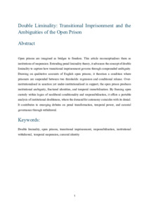 institutions of suspension. Building on work on penal liminality, it advances the concept of double liminality to capture how transitional imprisonment governs through compounded ambiguity. Drawing on qualitative accounts of English open prisons, it theorises a condition where prisoners are suspended between two thresholds: the threat of regression and conditional release. This dual suspension produces fractured autonomy, temporal instability, and structurally embedded uncertainty. By framing open custody within logics of neoliberal conditionality and responsibilisation, the article offers a generalisable analysis of institutional doubleness, where the demand for autonomy coincides with its denial. It contributes to emerging debates on penal transformation, temporal power, and carceral governance through absence.