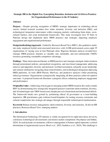 Strategic HR in the digital era: synergising retention, inclusion and AI-driven practices for organisational performance in the IT industry.