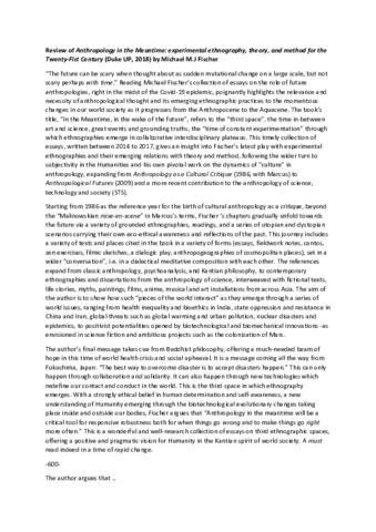 Review of "Anthropology in the Meantime: experimental ethnography, theory, and method for the Twenty-Fist Century" (Duke UP, 2018) by Michael M.J Fischer