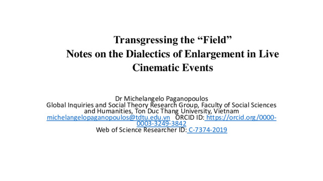 Paganopoulos, Michelangelo (2021) Transgressing the “field”: notes on the dialectics of enlargement in Live cinematic events. In: ISSH 2021: "The 2nd International Conference on Innovation in the Social Sciences and Humanities 2021", 17th - 18th December, 2021, Ton Duc Thang University, Ho Chi Minh City, Vietnam.