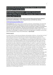 Paganopoulos, Michelangelo (2022) Decolonising Archives and systematic research: openings and challenges in Library Services. In: ASA2022 (Association of Social Anthropologists of Great Britain and Ireland): "Anthropology Educates", 14th March - 7th November, 2022, Online.