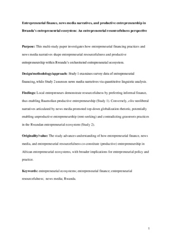 Entrepreneurial finance, news media narratives, and productive entrepreneurship in Rwanda’s entrepreneurial ecosystem: an entrepreneurial resourcefulness perspective.