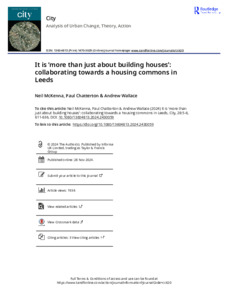McKenna, Neil, Chatterton, Paul and Wallace, Andrew (2024) It is ‘more than just about building houses’: collaborating towards a housing commons in Leeds. City: Analysis of Urban Change, Theory, Action, 28 (5-6). pp. 611-636. ISSN 1360-4813 (Print), 1470-3629 (Online) (doi:10.1080/13604813.2024.2430059)